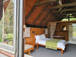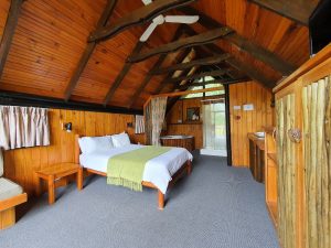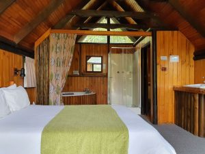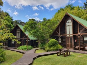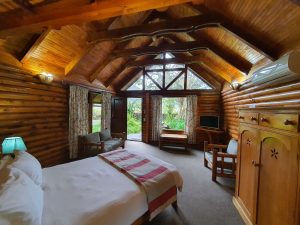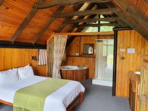 Guests stay in cozy log cabins, each with its own private deck overlooking lush gardens or forested slopes. Days can be spent exploring nearby hiking trails, relaxing at the spa, or simply unwinding in the jacuzzi while listening to the sounds of nature. Evenings bring hearty meals and fireside warmth, creating a homely atmosphere that regular visitors treasure.